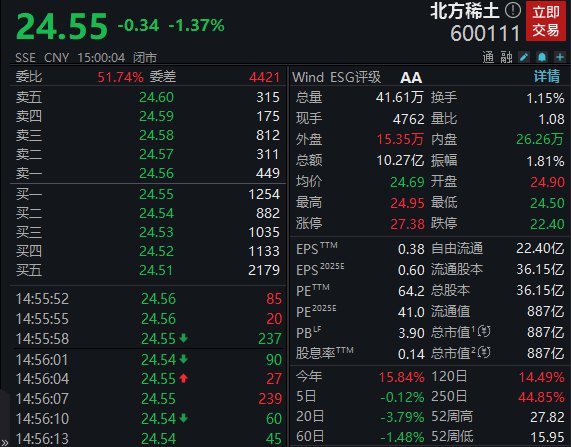 7月9日,北方稀土股价下跌1.37%,报24.55元/股,总市值为887亿元。