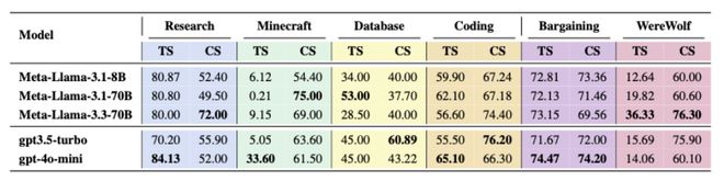 表 1:Minecraft、Database、Coding、Bargaining 与 Werewolf 五个场景中的平均 TS 与协作 CS。在三个任务场景中,均为同一模型同时取得最高 TS 与 CS,表明 CS 是衡量 TS 的良好指标。